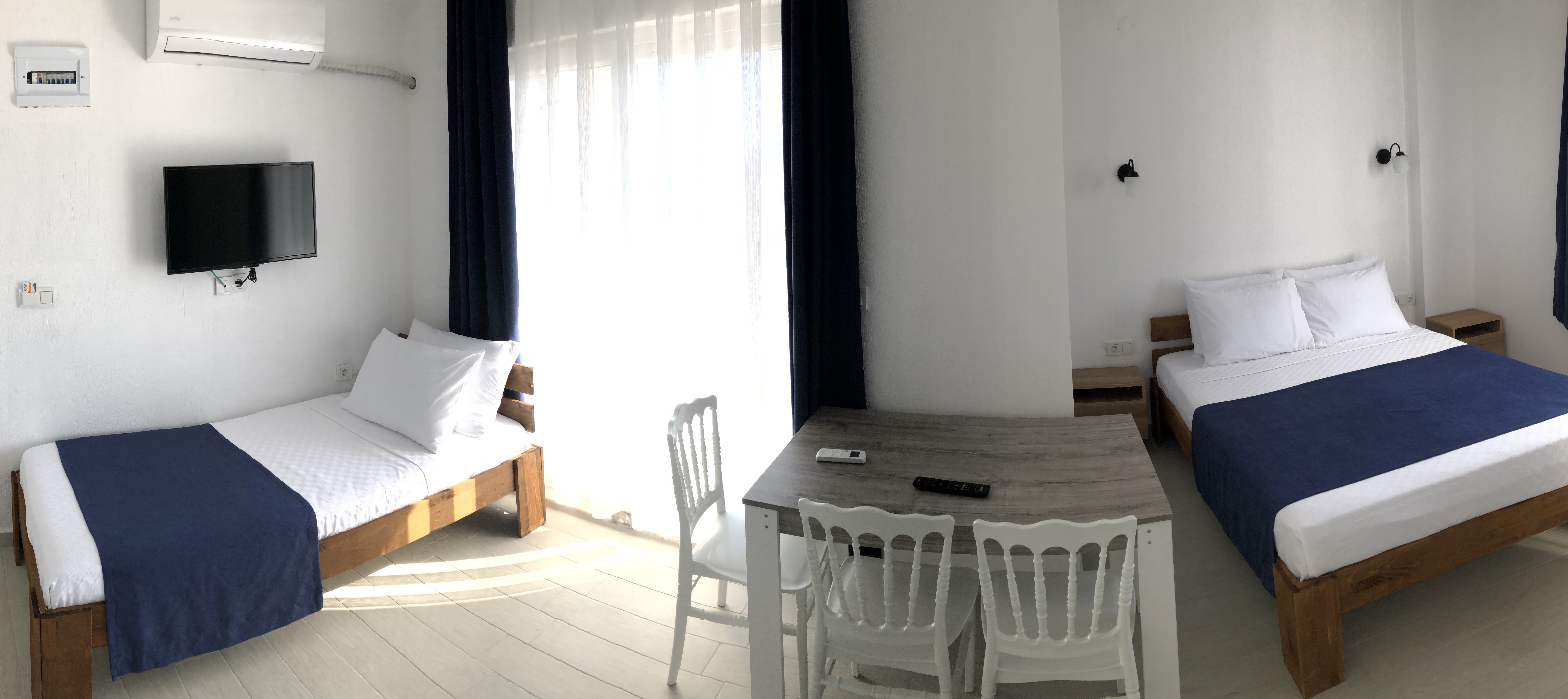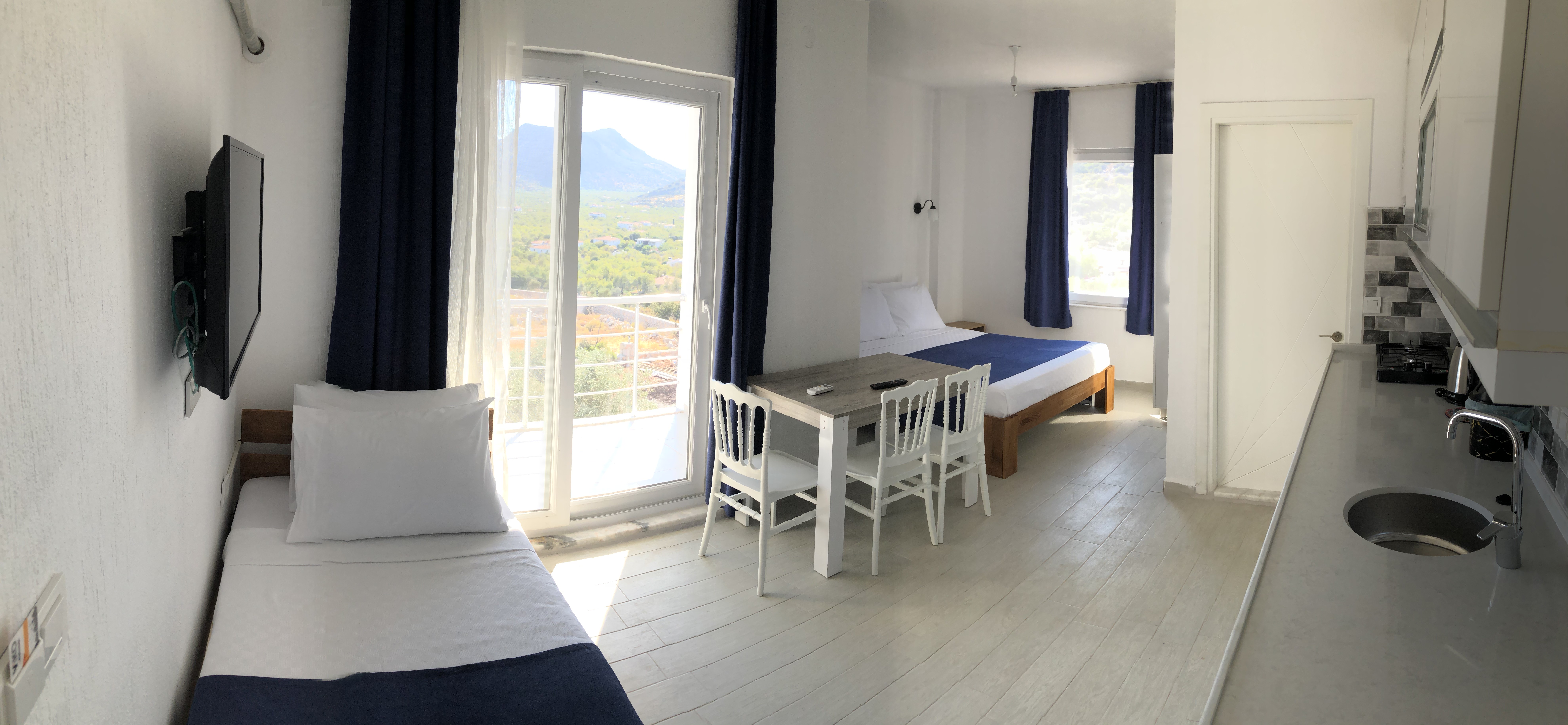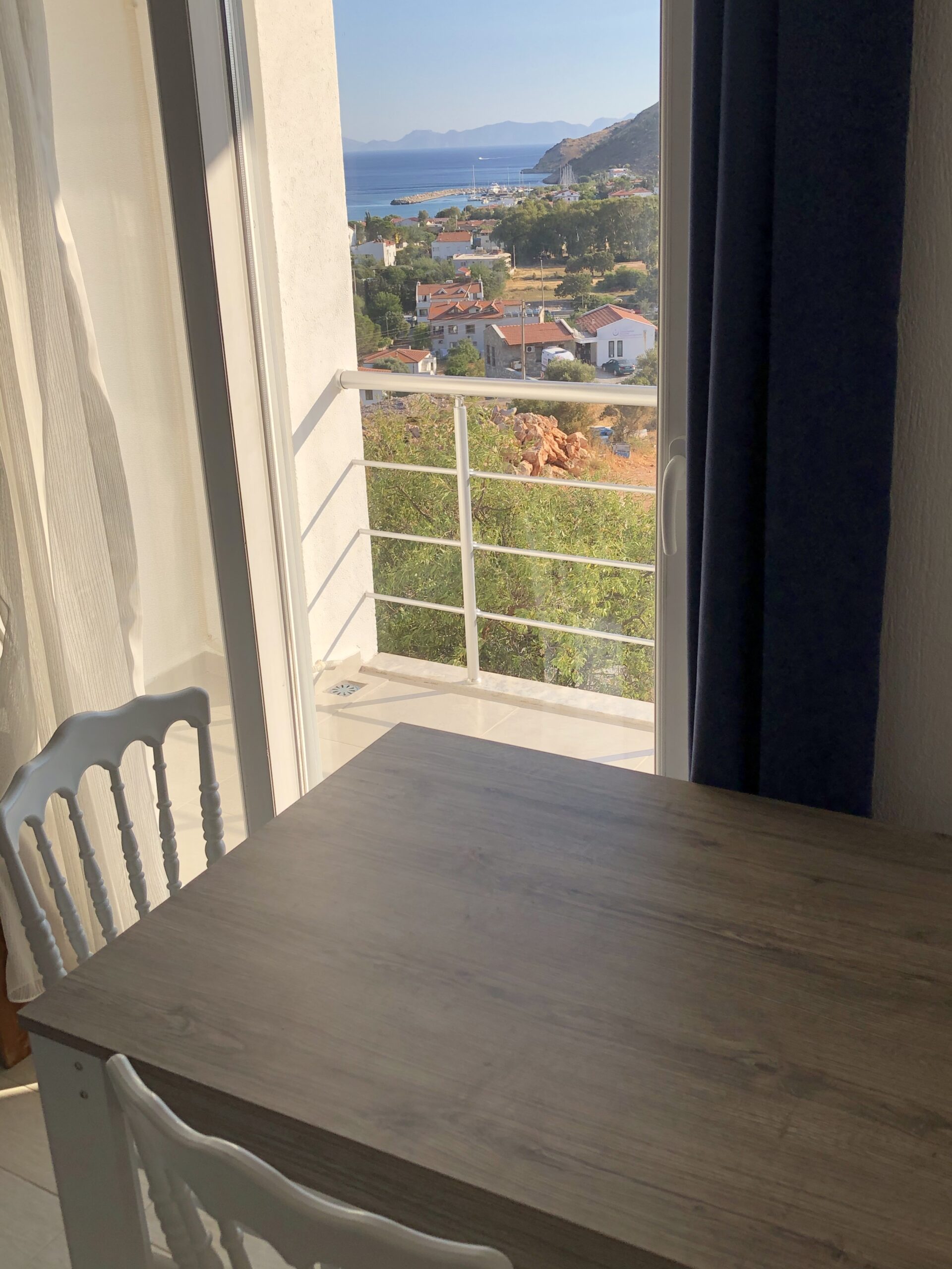 Deniz, liman, dağ ve doğa manzaralı rahat ve nezih odamız; konforlu ve huzurlu bir tatil imkanı sağlıyor.